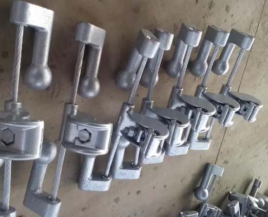 2)、锚固金具,又称紧固金具或耐线线夹。这种金具主要用来紧固导线的终端,使其固定在耐线绝缘子串上,也用于避雷线终端的固定及拉线的锚固。锚固金具承担导线、避雷线的全部张力,有的锚固金具变作为导电体